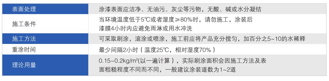 根據要求選擇配套體系,本產品可與大多數水性底漆和溶劑型漆配套使用,配套前應進行必要的測試評價。